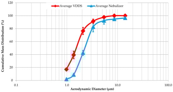 Comparison of cumulative mass distribution between vaping drug delivery system (VDDS) and nebulizer. Data are presented as mean ± standard deviation for each point from three independent experiments.