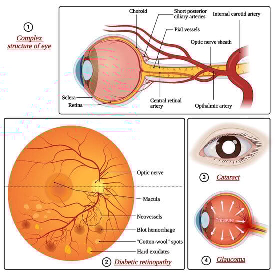 (1) The complex structure of the eye contains three coats to enclose the optically clear aqueous humor, lens, and vitreous body. The outermost coat consists of the cornea and sclera, and the middle coat consists of blood supply to the eye involving the choroid, ciliary body, and iris. (2) Diabetic retinopathy contains “Cotton-wool spots”, which are tiny white areas on the retina, the layer of light-sensing cells lining the back of the eye. (3) Cataracts can develop on aging or injury, resulting in changes in the eye lens involving the breakdown of the protein and fibers to make vision hazy or cloudy. (4) Glaucoma is a chronic, progressive eye disease caused by optic nerve damage leading to visual field loss. An abnormality in the eye drainage causing fluid to build up results in excessive pressure, causing damage to the optic nerve.