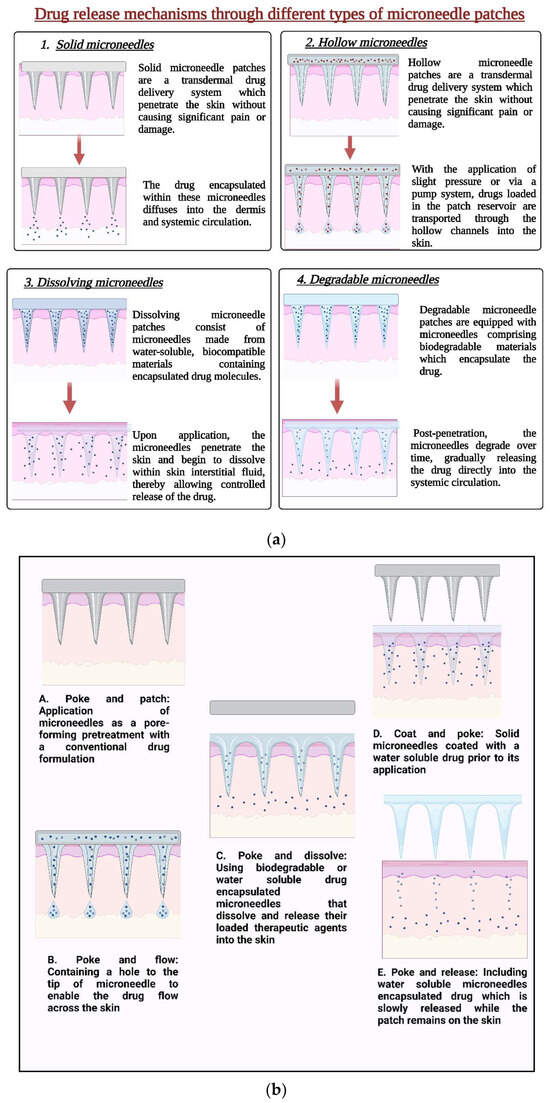 (a): The drug release mechanisms through different types of microneedle patches involve the following: 1. Solid microneedle drugs diffuse into the dermis and the systemic circulation. 2. Hollow microneedles involve the application of a slight pressure or pump system to deliver the drug through the hollow channels into the skin. 3. Dissolving microneedles penetrate the skin and begin dissolving into the skin interstitial fluid for drug release. 4. Degradable microneedles degrade over time and allow for gradual drug release directly into the systemic circulation. (b): Drug release mechanisms: A. Poke and patch including pore-forming pretreatment with a drug formulation. B. Poke and flow involving the hole into the tip of the microneedle for drug flow across the skin. C. Poke and dissolve involves the dissolution and release of therapeutic agents into the skin. D. Coat and poke involving the solid microneedles coated with a water-soluble drug before application. E. Poke and release includes the release of encapsulated drugs through water-soluble microneedles.