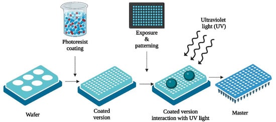 Photolithography, sometimes called “optical lithography”, utilizes light to imprint patterns from a photomask onto a light-sensitive chemical called a “photoresist”, which is coated onto a substrate. This method involves selectively eliminating unexposed areas. Photolithography follows a top-down methodology, with processing protocols and materials differing based on particular implementations. Nevertheless, they adhere primarily to a standard procedure, illustrated in Figure 4 [91]. Before coating the photoresist, thorough cleaning of the substrate, usually a silicon wafer, is essential to remove contaminants such as solvent stains (like methyl, alcohol, and acetone), atmospheric dust, residues from equipment and operators, microorganisms, aerosol particles, and similar impurities. This procedure necessitates operation within cleanroom facilities featuring a precisely controlled environment to maintain minimal airborne particulates, stable temperature, air pressure, suitable humidity levels, minimal vibration, and controlled lighting conditions [92]. In particular circumstances, notably in biomedical applications, the silicon wafer acts as a solid base for additional material layers. This choice stems from its favorable characteristics: rigidity, flatness, affordability, and smoothness [93].