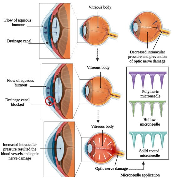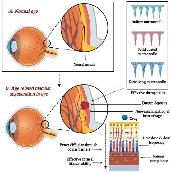 They are traditionally applied to the cornea, sclera, or suprachoroidal space (SCS), allowing for drugs to overcome barriers. Ocular drug delivery has three conventional approaches, topical application, intraocular injection, and systemic administration, with certain drawbacks when effectively delivering medication to the posterior segment of the eye [13]. Other avenues for administering drugs to the eye involve surgically implanting drug carriers to enable prolonged drug release into ocular or periocular tissues and precise topical administration through injections and conventional topical applications [14,15]. Nanotechnology could improve ocular therapy by addressing issues like poor intraocular penetration and rapid ocular elimination in traditional drug delivery routes [10]. The microneedle technique has been investigated as a promising method to enhance eye treatment, especially with coated, dissolving, and hollow types, proving particularly effective in drug delivery [16]. Conditions like myopia and presbyopia can often be corrected with glasses or lenses. In contrast, more severe conditions like age-related macular degeneration (AMD) and diabetic retinopathy require extensive treatment, posing a burden on healthcare systems.