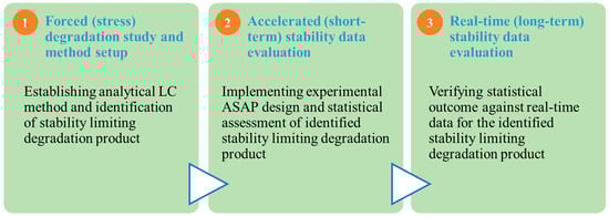 During stability studies, specific environmental conditions are applied for a predetermined period of time. Conventional stability studies are carried out as stated in the International Council for Harmonisation quality guidelines (ICH Q1A [R2]) []. In the product development cycle, protocol-driven, long-term stability testing requires a significant amount of time and resources, and involves substantial costs. The health authorities encourage the exploration and implementation of alternative approaches to support stability studies. Over the past few years, many such science- and risk-based approaches have been developed, particularly for solid drug products [,,,,,,,,]. In the last decade, the International Consortium for Innovation and Quality in Pharmaceutical Development (IQ) formed a working group to focus on and build a roadmap for the use of Risk-Based Predictive Stability (RBPS) tools. The working group discussed several case studies that are used during the regulatory submission process. Considering the acceptance from many regulatory authorities, it is clear that future stability designs will utilize predictive stability approaches to support the traditional ICH stability program [,,]. Waterman provided an overview of the application of the Accelerated Stability Assessment Program (ASAP) for predicting the shelf life of a solid oral drug formulation []. Since then, the ASAPprime software, version 6.0, has been widely implemented in the pharmaceutical industry to support accelerated stability testing of compounds, particularly for small molecules. Based on the understanding that it takes longer for molecules to degrade under mild conditions, the approach of the ASAP is to mimic the chemical drug degradation process using accelerated conditions.