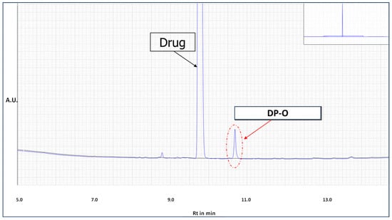 The samples exposed to the accelerated and real-time storage conditions were withdrawn and analyzed using the LC method. The percentage degradation observed in each of the conditions is captured in Table 1. The chromatographic peaks for the drug and the DP-O are shown in Figure 2.