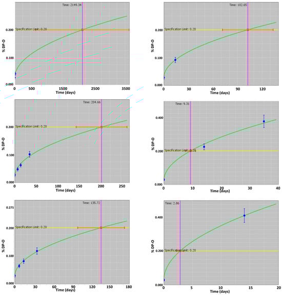 The isoconversion paradigm was applied in the ASAPprime software to predict the shelf life of the drug product. For each assessed storage condition, the individual isoconversion graphs (percentage DP-O level versus time in days) are presented in Figure 3. Initially, linear zero and first-order kinetics were applied to the data; however, R2 and Q2 values were observed to be <0.90 and <0.70, respectively. Both models were subsequently eliminated due to poor representation of drug degradation (plateau formation) and their limited predictive power. Thus, the software’s in-built diffusion kinetics method was applied. Diffusion kinetics behaviors are expected for the oxidative degradation mechanism, in which the rate-determining step is diffusion-dependent, especially for solid drug products [,,,]. The obtained goodness of fit (R2 > 0.95) and goodness of prediction (Q2 > 0.80) parameters indicated the acceptable precision of the chosen diffusion kinetics []. The model was also subsequently evaluated and verified using the long-term data. Altogether, the results demonstrated that the diffusion kinetics model was the robust choice for accurate shelf-life prediction. The mathematical form of the diffusion equation is detailed in the Supplementary Material (Equation (S1)).