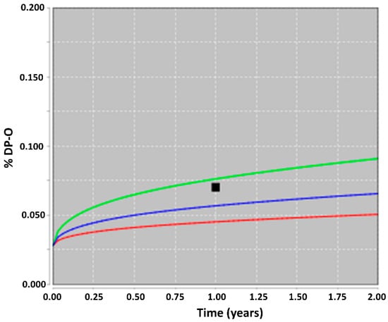 Real-time percentage DP-O levels at 25 °C/60% RH over time (in years) compared with the model predicted plot. Blue line: average predictions; green and red lines: ± standard deviation. The black square denotes the long-term, real-time data (1-year data).