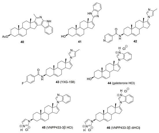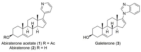 Prostate cancer (PC) is the fourth cancer by incidence worldwide, the second most frequent cancer in men, and the fifth leading cause of cancer death among men in 2022. It is the most frequently diagnosed cancer among men in 118 countries (out of 185) [1]. This led to the development of a number of different PC treatment methods, such as surgery, radiation therapy, hormone therapy, chemotherapy, targeted therapy, immunotherapy, and bisphosphonate therapy, and some new types of treatment are being tested in clinical trials [2]. Hormone therapy is essential because PC development and growth are often associated with androgens due to the presence of androgen receptors in cancer cells. Huggins and Hodges first discovered this connection between androgens and PC in the early 1940s, and their orchiectomy application in PC treatment marks the beginning of androgen deprivation therapy (ADT) [3]. ADT has two mechanisms of action: preventing androgen from binding to androgen receptors using antiandrogens, and reducing androgen concentrations by preventing their biosynthesis. The second one is especially important in castration-resistant prostate cancer (CRPC), where residual androgens, synthesized by adrenal glands and intratumors, prevail [4]. The most well-known drug with this mechanism of action is abiraterone acetate (AA, 1, Figure 1), also known under its IUPAC name as 17-(pyridin-3-yl)androsta-5,16-dien-3β-yl acetate, as well as trade names Zytiga and Yonsa [5]. Its active metabolite abiraterone (2, Figure 1) is a potent, irreversible, and selective inhibitor of 17α-hydroxylase/C17,20-lyase (CYP17A1), an enzyme involved in androgen biosynthesis in testicular, adrenal, and prostatic tumor cells. AA was developed as an orally bioavailable prodrug with enhanced stability and absorption, because of abiraterone’s poor oral bioavailability [6]. These two compounds were synthesized at the beginning of the 1990s by Barrie and colleagues [7], while abiraterone acetate was approved for clinical use in 2011 [8]. Its usage continues to date, primarily for the treatment of metastatic castration-resistant prostate cancer and metastatic high-risk castration-sensitive prostate cancer. Nevertheless, a search for novel hormone therapeutics in PC treatment never stops, and one of the compounds that have progressed the furthest in clinical studies is galeterone (3, Figure 1). Similar to abiraterone, it has a nitrogen-containing heterocyclic ring in the side chain; its IUPAC name is 17-(1H-benzimidazol-1-yl)androsta-5,16-dien-3β-ol and it has a triple mechanism of action, acting as an androgen receptor antagonist, androgen receptor down-regulator, and CYP17A1 inhibitor. Galeterone synthesis was first published in 2005 by Handratta et al. [9], and since then, clinical studies have been canceled and continued multiple times. The importance of abiraterone in PC treatment as well as galeterone in drug development motivated us to prepare this review that covers literature analysis regarding the synthesis of these two compounds, recent advances in their biological activity, and structural modifications that could lead to improved anticancer agents.