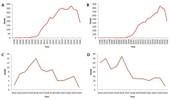 Six online databases, Scopus, PubMed, Web of Science, SciFinder, ScienceDirect, and Google Scholar, were used during August and September of 2024 to retrieve studies in the literature regarding abiraterone and galeterone. Two primary searches were performed using “abiraterone” and “galeterone” as search terms on 16 August 2024. A search within all fields regarding abiraterone provided 19,864 results in Scopus, 3553 in PubMed, 6372 in Web of Science, 6675 in ScienceDirect, and 45,600 in Google Scholar. As expected, the search term “galeterone” gave significantly lower numbers, with 712 results in Scopus, 90 in PubMed, 124 in Web of Science, 256 in ScienceDirect, and 1240 in Google Scholar, still indicating a need for more refined searches. Hence, the literature search was carried out within the “Article title, Abstract, Keywords”, “Title, Abstract”, and “Topic” research fields in Scopus, PubMed, and Web of Science, respectively. Furthermore, refined searches were performed in all databases using additional keywords: synthesis, biotransformation, biological activity, clinical studies, analogs, derivatives, and modifications. Since the first publication of abiraterone synthesis in 1993, publication numbers regarding abiraterone continued to grow in both PubMed and Scopus (Figure 2A,B), while the number of publications regarding galeterone reached its peak in 2016 (Figure 2C,D).