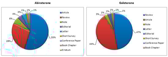 For abiraterone, most of the publications were research articles (55%), while for galeterone, most were review articles (47%, Figure 3). Most of the review articles dedicated to abiraterone involve a comparison of the biological activities of abiraterone acetate and other drugs, such as enzalutamide [10]. There are also reviews dedicated solely to medical applications of abiraterone [11,12], but none of those have the point of view of medicinal chemists and include synthetic procedures and biologically active derivatives. To our knowledge, unlike abiraterone, there is only one review dedicated solely to galeterone [13].