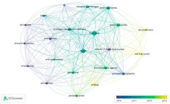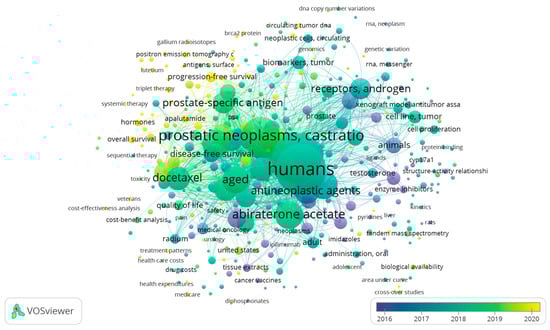 VOSviewer generated an overlay visualization graph with the co-occurrence of keywords related to abiraterone.