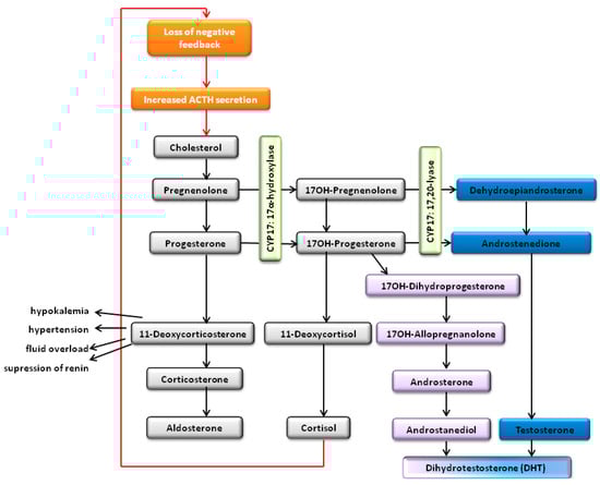 Congenital adrenal hyperplasia (CAH) is an autosomal recessive disorder that affects the cortex of the adrenal gland and is caused by a deficiency of the enzyme 21-hydroxylase. Inadequate conversion of 17-hydroxyprogesterone to 11-deoxycortisol leads to impaired cortisol synthesis, while 21-hydroxylase deficiency (21-OHD) also causes the incorrect secretion of aldosterone [84,85].
