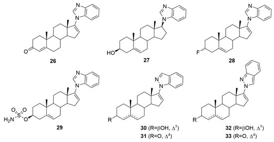 - Moreira, V.M.; Vasaitis, T.S.; Njar, V.C.; Salvador, J.A.R. Synthesis and evaluation of novel 17-indazole androstene derivatives designed as CYP17 inhibitors. Steroids 2007, 72, 939–948. [Google Scholar] [CrossRef]