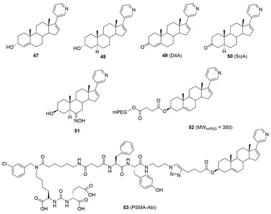 - Meng, S.; Zhu, N.; Han, D.; Li, B.; Zhang, X.; Zhang, J.; Liu, T. Synthesis and Biological Evaluation of Methoxypolyethylene-Glycol-Substituted Abiraterone Derivatives as Potential Antiprostate Cancer Agents. Mol. Pharmaceutics 2024, 21, 3186–3203. [Google Scholar] [CrossRef]