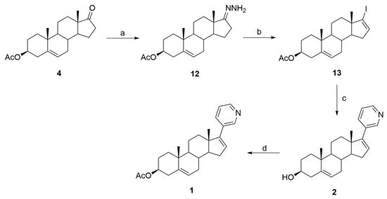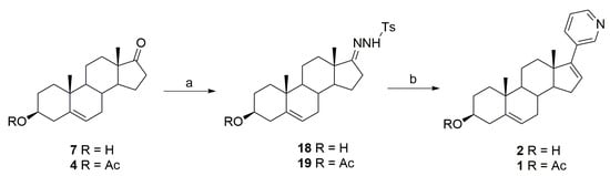 Although the syntheses of steroids having a pyridin-3-yl or 3-pyridonyl group in the 17β position are already known [14,15], Barrie et al. [7] synthesized a series of steroidal compounds which contain, in addition to a 17-(pyridin-3-yl) substituent, a 16,17-double bond in ring D. This led to the development of 17-(pyridin-3-yl)androsta-5,16-dien-3β-ol (2), which was identified as a potent inhibitor of CYP17A1 [16]. Starting dehydroepiandrosterone 3-acetate (4) was converted into 17-enol triflate 5 by treatment with trifluoromethanesulfonic anhydride and 2,6-di-tert-butyl-4-methyl pyridine (DTBMP) (Scheme 1). This reaction also produced 3,5-diene 6 in 10% yield as a by-product. Then, the pyridin-3-yl group was introduced into the C17 position in the reaction of compound 5 with diethyl(pyridin-3-yl)borane (BET) in THF, using bis(triphenylphosphine)palladium(II) chloride as a catalyst and aqueous Na2CO3 as a nucleophilic activator. The acetyl group of compound 1 was removed with aqueous methanolic NaOH to produce steroid 2 [7,17].