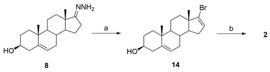 In order to overcome the shortcomings of the reported methods of synthesis of abiraterone (2), Mahra et al. [31] used 17-bromoandrosta-5,16-dien-3β-ol (14) instead of 17-iodo derivative 9 for Suzuki coupling (Scheme 4). Due to the shorter reaction time, bis-steroid 10 was not formed.