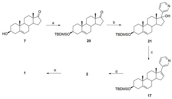 In another reported method, boronic acid of 3-silyl-protected dehydroepiandrosterone 16 was coupled with 3-bromopyridine and resulted in 17 (Scheme 5) [32]. After deprotection, abiraterone (2) was obtained. The drawbacks of this method are the use of protective groups and the need for chromatographic purification.