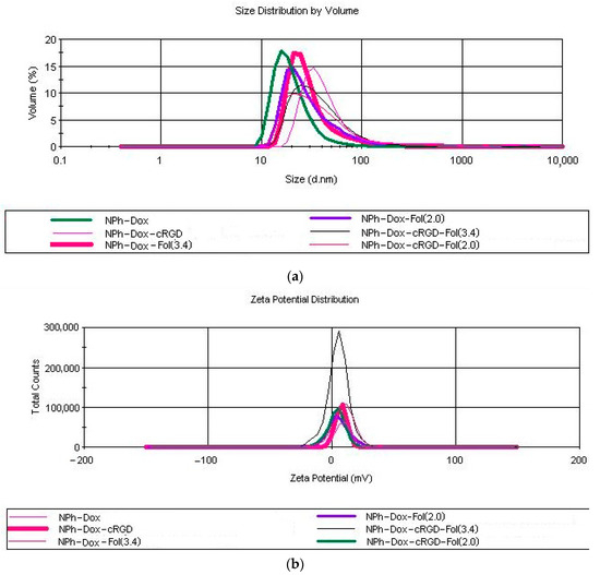 Particle size distribution (a) and zeta potential (b) in the prepared doxorubicin nanocompositions.