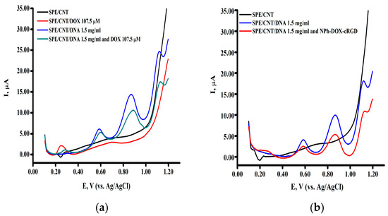 The differential pulse voltammograms (a) of the dsDNA complex (1.5 mg/mL) with doxorubicin and (b) of the dsDNA complex with the phospholipid composition of doxorubicin NPh-Dox-cRGD. The measurements were performed in the potential range of +0.1 ÷ +1.2 V, in an aerobic environment at room temperature.