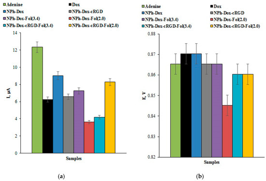 (a) The histogram of the effect of doxorubicin and its nanoforms on the oxidation peak current of adenine in dsDNA; (b) The histogram of the effect of doxorubicin and its nanoforms on the electro-oxidation potential of adenine. The measurements were performed by DPV in the potential range of +0.1 ÷ +1.2 V, in an aerobic environment at room temperature.