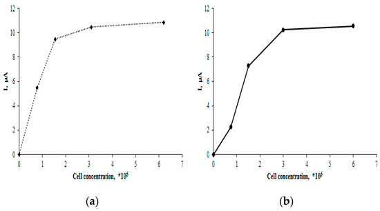 The electrochemical analysis of the breast cancer cell lines MCF-7 and MDA-MB-231 was performed using square wave voltammetry in the potential range of 0.0 to +1.0. Square wave voltammetry (SWV) was chosen as the most sensitive method, which registered the electrochemical signatures of the MCF-7 and MDA-MB-231 cell lines. The cells were immobilized on SPE/CNT electrodes. The results demonstrated that the oxidation peak current of MCF-7 cells was dependent on the logarithm of the cell concentration, which is consistent with the literature data [42,43,44]. The presented data (Figure 4a) show that the electro-oxidation peak current increased with the cell concentration, reaching a plateau at the cell concentration of 6 × 105. A similar relationship was observed for the MDA-MB-231 cell line (Figure 4b).