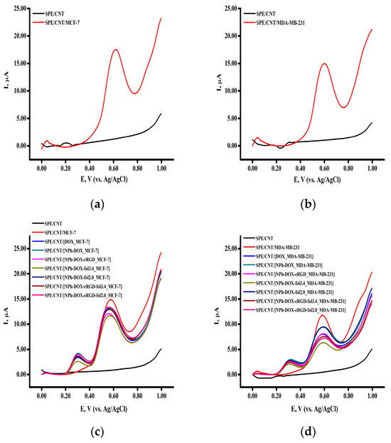 In further studies of the effect of doxorubicin and its nanoforms on breast cancer cell lines, 5 × 104 cells were applied to the electrode. Figure 5a,b shows the voltammograms of the MCF-7 and MDA-MB-231 cells obtained by SWV.