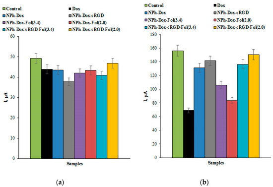 However, we obtained more pronounced effects of Dox derivatives on cell lines of breast cancer using cell concentration as a reference method (Figure 5a,b). In all experiments with cell lines, we used approximately the same concentration of cells (which was measured on a ViCell XR analyzer), such as 4.4 ± 0.3 MCF-7 cells/electrode and 1.9 ± 0.2 MDA-MB-231 cells/electrode. Using this more correct approach, we can see from Figure 5a,b that the most intense decline in the peak current corresponded to the MCF-7 cells, which express the folate receptor, and this response was registered for the Dox derivative NPh-Dox-Fol(3.4). In the case of the MDA-MB-231 cell line, which possesses both integrin αvβ3 and folate receptor (FRα+) expression, the most intense decline in the peak current corresponding to the cell response was registered for the Dox derivatives NPh-Dox-cRGD-Fol(3.4), NPh-Dox-Fol(3.4), and NPh-Dox-cRGD-Fol(2.0). In these experiments, we register the clear influence of vector systems on the activity of Dox derivatives on the cell lines.