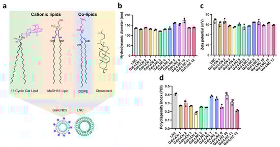 LNC and Gal-LNC characterizations. (a) Lipid structures of LNC and Gal-LNC, (b) size, (c) zeta, and (d) polydispersity indexes of LNC and Gal-LNC (n = 3).