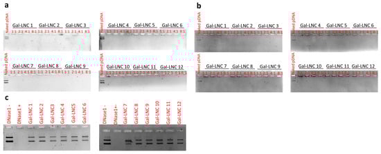 To evaluate the binding efficacy of liposomes, a gel retardation assay was conducted, yielding detailed results that demonstrate robust complexation of all Gal-LNC variants (1–12) with pDNA across all tested N/P ratios, including 1:1, 2:1, 4:1, and 8:1, as illustrated in the accompanying Figure 2a. Additionally, a heparin displacement assay assessed the competitive interactions between nucleic acids and other negatively charged molecules in the bloodstream. Heparin, a highly negatively charged polysaccharide integral to the extracellular matrix of various tissues and found on cell surfaces, was introduced to the lipoplex containing pDNA. Remarkably, the presence of heparin did not compromise the stability of the lipoplex against competitive binding, as shown in Figure 2b. Furthermore, a DNase I protection assay confirmed the liposomes’ capability to protect complexed pDNA (1:1 N/P charge ratio) from endonuclease degradation. Following the introduction of DNase I and proteinase K to the lipoplex, along with phenol: chloroform, unprotected pDNA exhibited no degradation, resulting in the detection of a band, which serves as the negative control (Figure 2c). In contrast, adding DNase I to naked pDNA led to hydrolysis of the pDNA backbone, affirming its liability. In absolute comparison, the lipoplexes successfully evaded degradation and accumulated in the aqueous phase after the phenol–chloroform treatment.