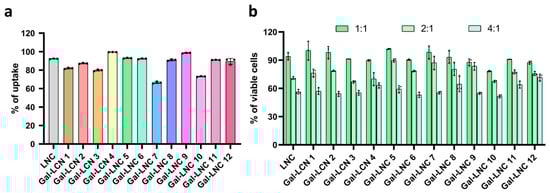 In vitro compatibility of LNPs. (a) Uptake assay of LNC and Gal-LNC 5, % of uptake analyzed by Flow cytometry, (b) Cytotoxicity assay of LNC and Gal-LNC (n = 3).