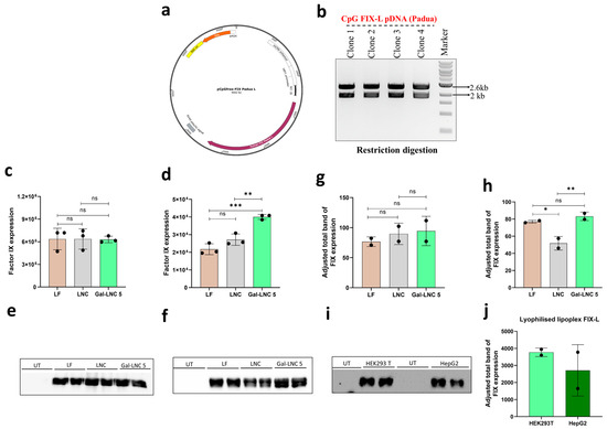 Subsequently, the CpG-free FIX-L plasmid was prepared. We employed restriction digestion and sequencing techniques to confirm the successful cloning of the FIX-L plasmid, as illustrated in Figure 4a,b. The functional analysis of the CpG-free FIX-L pDNA was quantified using qPCR in both HEK293T and HepG2 cell lines (Figure 4c). The results displayed that the FIX expression was non-significant between the groups; the Gal-LNC 5 is equivalent to LF with the expression range of 7 × 105; on the other side, the HepG2 hepatic cell line shows an attractive result that LF gives lesser expression than both our LNC and Gal-LNC 5-LNC group; this may be because HepG2 was hard to transfect cell line. The Gal-LNC 5 reached 4 × 104, which is more significant than LF 2 × 104. This shows that the Gal-LNC 5 is more efficient in transfecting cells that are challenging to transfect (Figure 5d). For protein expression, Western blot was used, and the same qPCR results were replicated in WB; briefly, the non-hepatic cell line HEK293T was equivalent in all the groups, including LF, LNC, and Gal-LNC 5 (Figure 5e,g). However, HepG2 Gal-LNC 5 had more significant protein expressions than LNC and was comparable to LF (Figure 5f,h).