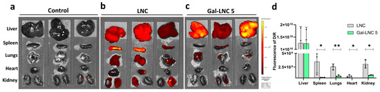 Biodistribution of 16 cyGAL5. (a) Control mice; (b) Localization of LNC to the liver and other organs; (c) Uptake of Gal-LNC 5 to liver; (d) Epifluorescence of Gal-LNC 5 (n = 3) * p < 0.01 ** p < 0.001.