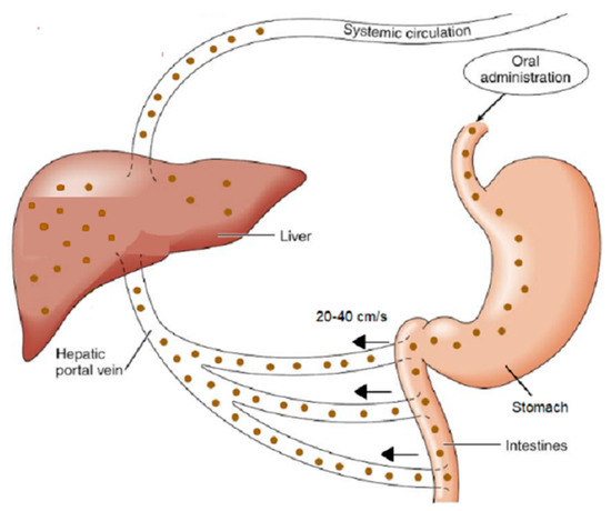 However, the unphysical hypothesis of infinite time for oral drug absorption associated with Equation (2) was proposed in 2019 [11]. A disruptive paper introducing the overlooked-for-decades physiologically sound finite absorption time (F.A.T.) concept in oral drug absorption was published in 2020 (see Figure 2 in [12]). Specific time constraints for drug absorption from the small intestines and colon, at 5 h and 30 h, respectively, are applied in accord with the literature values [13]. The high blood flow rate in the portal vein (20–40 cm/s) [14] imposes the rapid removal of the absorbed drug molecules towards the liver maintaining sink conditions in the first-order drug transfer; thus, oral drug absorption obeys zero-order kinetics; see Figure 1. Furthermore, the relevant physiologically based finite-time pharmacokinetic (PBFTPK) models were developed and used for the analysis of oral concentration and time data [15]. Using the PBFTPK models, the kinetics of drug absorption is described in terms of the number of absorption stages and their corresponding input rate, which replace the fallacious unique first-order absorption rate constant [15,16,17,18]. In parallel, the bioavailability parameters AUC and Cmax were re-interpreted [19,20], novel bioequivalence metrics for the rate and extent of absorption were suggested [21], and the construction of (i) the percent absorbed versus time curves and (ii) the in vitro–in vivo correlations were revamped [22,23], while the finite dissolution time was introduced and used in the realm of BCS [24].