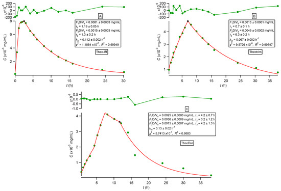 (A) Best fit results of Equations (31)–(33) reported in [15] for theophylline (immediate-release) experimental data [35]. (B) Best fit results of Equations (31)–(33) reported in [15] for Theotrim (extended-release) experimental data [35]. (C) Best fit results of Equations (34)–(37) reported in [15] for Theodur (extended-release) experimental data [35]. The symbol ▲ denotes the end of the absorption process. The top panel depicts the fit residuals.