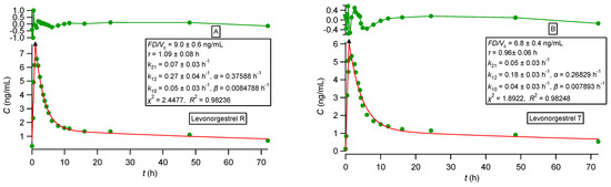 (A) Best fit results of Equationss (38) and (40) reported in [15] for levonorgestrel (reference) experimental data [36]. (B) Best fit results of Equations (38) and (40) reported in [15] for levonorgestrel (test) experimental data [36]. The symbol ▲ denotes the end of the absorption process. The top panel depicts the fit residuals.