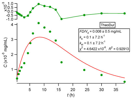 The estimates of the bioavailable fraction for the drugs following one-compartment-model kinetics are reported in Table 2. The estimate for ketoprofen of 0.98 underlines its complete absorption and not only agrees with the literature data [37] but also indirectly verifies the absence of first-pass effect. The lower estimate of 0.78 for the bioavailable fraction, given in Table 2, should be linked with the prevailing role of the value of τ in the estimation of F from oral data using Equation (3), i.e., the error associated with the estimation of τ is propagated to the estimate for F. The estimate (0.91), Table 2, derived from Equations (4) and (5) for theophylline’s bioavailable fraction corresponding to the immediate-release formulation, agrees with the literature data [38,39]. The estimates (0.8, 0.84, and 0.75) were derived for F from the analysis of the extended-release Theotrim and Theodur theophylline formulations, respectively; see Table 2. Although the F estimates for Theotrim are not reported in the vast literature of theophylline formulations, Theodur exhibits complete absorption (F = 0.97) when administered in doses of 100 to 300 mg [40,41]. Our semi-compartmental estimation approach based exclusively on oral data and the use of Equation (5) is heavily dependent on the estimation of τ and leads to a much lower estimate for F, i.e., 0.75. Due to the complex nature of theophylline absorption from Theodur, as seen in Figure 3C, the estimation of τ is subject to error, which affects the parameter in the denominator of Equation (5). In the present case, this results in underestimation of F.