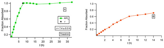 We also constructed the fraction absorbed versus time plots for the three formulations of theophylline following the methodology based on the F.A.T. [22] and compared the plots with the corresponding plots reported in the literature [36]; see Figure 6, Figure 7 and Figure 8. For the immediate-release theophylline formulation, our approach (Figure 6A) shows that absorption reaches the theoretical maximum (fraction absorbed = 1) at 1.7 h. The reported plot (Figure 6B) shows an asymptotic increase in fraction absorbed reaching a plateau (0.8) at 3 h. This is unexplained since both the classical Wagner–Nelson method and our approach based on F.A.T., by definition, always reach fraction absorbed = 1 [22]. The Theotrim results are shown in Figure 7. Again, the plot based on the F.A.T. in Figure 7A [22] shows that the expected maximum (fraction absorbed = 1) is reached in 7.4 h, which is very close to the estimate 7.0 h derived from the nonlinear regression analysis fit (Figure 3B and Table 1). On the contrary, the plot reported in [36] and replotted in Figure 7B exhibits an increase in the fraction absorbed as a function of time for 14 h, reaching asymptotically 0.8, which is remarkably lower than the expected maximum fraction absorbed = 1. The Theodur plots shown in Figure 8 have similar profiles with Theotrim. The plot, Figure 8A, derived from the F.A.T. analysis [22] shows the three successive absorption phases (Figure 3C and Table 1) reach the expected plateau maximum at 10.5 h, which is close to the τ estimate 11.6 h quoted in Table 1; the reported plot [36] for Theodur shows an asymptotic increase in the fraction absorbed for 14 h, reaching a questionable plateau, fraction absorbed = 0.6. All results of the theophylline formulations are also important for the pharmaceutical scientists working on drug dissolution. In fact, the current dissolution tests have limited predictability since the zero-order drug input is not taken into consideration. A two-phase system based on drug dissolution–uptake is most akin to in vivo conditions since it provides a zero-order input as observed in our previous study [22].
