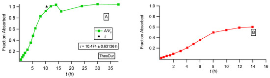 Fraction absorbed versus time plots for the Theodur formulation calculated in two different ways: (A) based on PBFTPK parameters with symbols defined in [35] and the black triangle denoting the termination of drug absorption and (B) data replotted from [36].