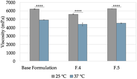 Determination of viscosity directly at room temperature (25 °C) and at physiologic temperature 37 °C. Gels F4 and F5 were determined using the shear rate 20 1/s. Results are presented as the mean ± SD, and n = 3. **** p < 0.0001.