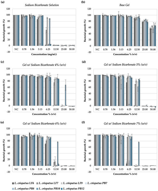 For the sodium bicarbonate gels, all strains were shown to be susceptible to at least 25% (v/v) dilution of the products. Small variations in the results occurred, with some dependent on the testing strains and others on the concentration of sodium bicarbonate in the gel. L. crispatus PB7 was the most sensitive strain to all gels tested, with an MIC value of 6.25% (v/v) dilution. With a similar profile to the sodium bicarbonate solution, L. crispatus LF7, LF9, and PB10 showed lower susceptibility to the gels with sodium bicarbonate. The gel base (B—without sodium bicarbonate) showed no antimicrobial activity.