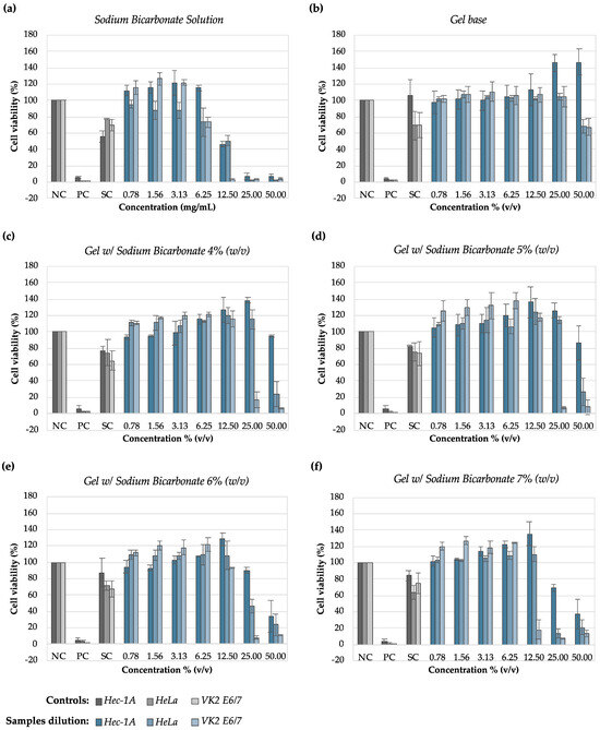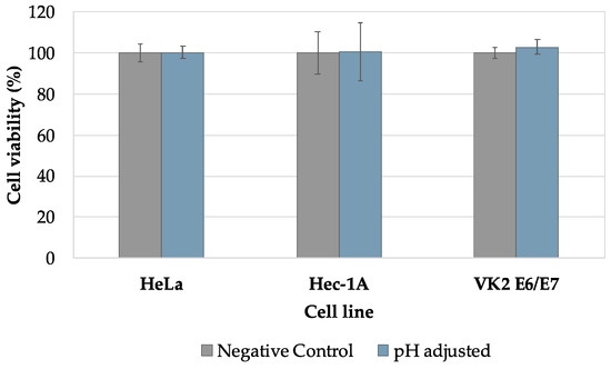 In order to elucidate the effect of the sodium bicarbonate on cell viability, HeLa, Hec-1A, and VK2 E6/E7 cell lines were incubated with culture medium with the pH adjusted to 8.3. This pH value was previously determined by measuring the 50% (v/v) dilution of sodium bicarbonate gel in the different culture media. The cell lines were left in contact with the adjusted culture medium for 24 h at 37 °C in the presence of 5% CO2. Cell viability was evaluated according to the MTT method, as described in Section 2.4.2.