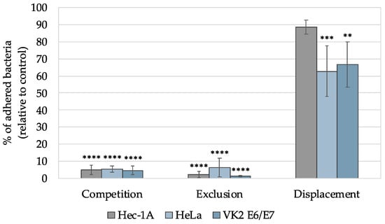 Adhesion profiles of the Lactobacillus crispatus PB8 strain to Hec-1A, HeLa, and VK2 E6/E7 cell lines in the presence of the gel with sodium bicarbonate 4% (m/v). Results are presented as the mean ± SD, and n = 3. ** p < 0.01, *** p < 0.001, and **** p < 0.0001 represent statistical significance in comparison with the control (100% bacterial adhesion).