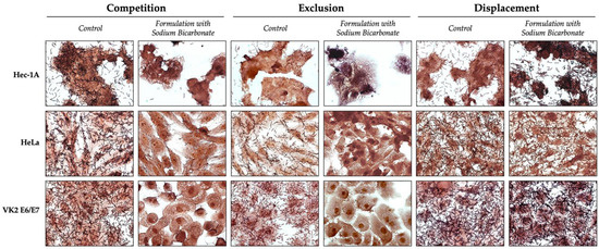 Representative microphotographs (630×) of the different approaches used to study the interference of the gel containing 4% (w/w) sodium bicarbonate with Lactobacilli crispatus PB8 adhesion to epithelial cells. Each row of the panel corresponds to a cell line (Hec-1A, HeLa, and VK2 E6/E7), and in each column, the different approaches (competition, exclusion, and displacement) that were performed for the control and the gel with 4% (w/w) sodium bicarbonate are shown.