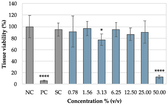 Tissue viability profile for gel with 4% (w/w) sodium bicarbonate at dilutions ranging from 0.78 to 50% (v/v). NC—negative control; PC—positive control; SC—solvent control. Results are presented as the mean ± SD, and n = 8. * p < 0.05; **** p < 0.0001 represents statistical significance in comparison with negative control.