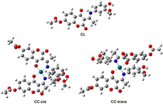 The geometry optimizations of the ligand and complex were carried out using density functional theory (DFT) employing the functional B3LYP with empirical dispersion corrections D3BJ (with Becke and Johnson damping) [34,35]. For the non-metallic atoms, a 6–311+G(d,p) basis set was used, while for Pd, the def2-TZVPD basis set was chosen [36], as implemented in Gaussian 09 software [37]. The structures were optimized at 298 K without any geometrical restrictions. The equilibrium geometries had no imaginary vibrations. The complex CC can exist in two conformations, cis and trans. The relative abundance of the conformers was determined based on their energies through the Boltzmann distribution formula used for this purpose: