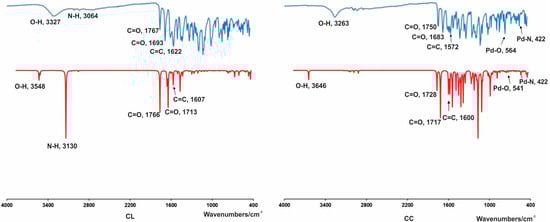 A previously synthesized and fully characterized ligand [12] was used to synthesize a new palladium complex. An aqueous potassium tetrachloropalladate(II) and a methanol solution of bidentate coumarin ligand were utilized to form a coumarin–palladium(II) complex, CC. For six hours at room temperature, solutions of the ligand and palladium(II) salts were continuously stirred on a magnetic stirrer [32,33]. A moderately good yield of the novel palladium(II) complex was produced following precipitation, filtering, and air drying. After several attempts, the crystallization of the obtained complex was unsuccessful, and its X-ray crystallographic structure could not be determined. Spectral characterization of CL and CC is given in the manuscript, while their corresponding spectra are shown in the Supplementary Materials.