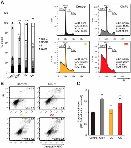 Figure 3. Effects of CL and CC on cell cycle distribution and apoptotic process. Human cervical adenocarcinoma cells (HeLa) were treated with an IC50 dose of CL, CC, or cisplatin (CisPt), whereas the controls were left untreated. After 72 h, the cells were analyzed using flow cytometry. (A) Cell cycle distribution presented as the mean ± SD of at least three independent experiments (left). Representative flow cytometry histograms from one of three independent experiments are shown (right). (B) Representative flow cytometry dot plots from one of three independent Annexin V-FITC/PI double staining experiments. The percentage of early (Ann + PI−) and late (Ann+PI+) apoptotic cells is shown as the mean ± SD from 3 repeated experiments. (C) Caspase activation analysis shown as the mean fluorescent intensities (MFI) of ApoStat normalized to the control. Presented are the mean ± SD of at least three independent experiments. *—p < 0.05 and **—p < 0.01 in comparison to the control, one-way ANOVA with Bonferroni correction.