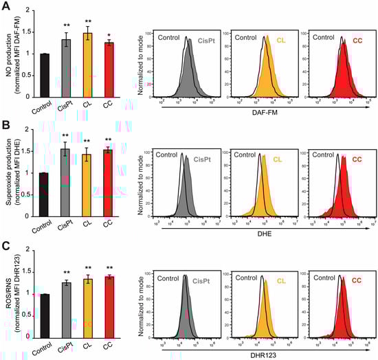 Figure 4. Effects of CL and CC on ROS/RNS production in HeLa cells. HeLa cells were exposed for 72 h to an IC50 dose of the tested drugs and subsequently analyzed using flow cytometry. (A) Intracellular NO production was detected using DAF-FM staining. (B) Superoxide anion radical production was detected with DHE staining. (C) DHR123 was used for the detection of reactive oxygen (ROS) and nitrogen (RNS) species. (AC) The mean fluorescent intensities (MFI) normalized to the control are presented as the mean ± SD of at least three independent experiments (lefts). Representative flow cytometry histograms from one of three independent experiments are shown (right). *—p < 0.05 and **—p < 0.01 in comparison to the control, one-way ANOVA with Bonferroni correction.