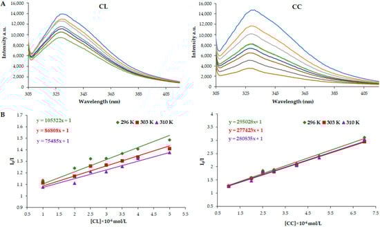 Figure 5. (A) Emission spectra of HSA in the presence of the corresponding compound (CL and CC). (B) The Stern–Volmer graph used to calculate the KSV and quenching constant kq at different temperatures.