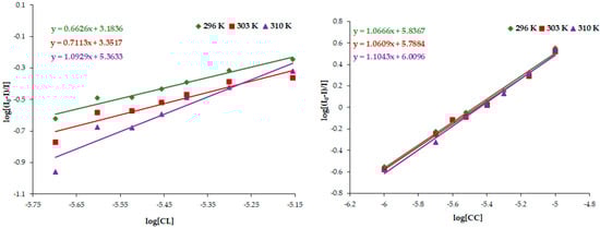 Figure 6. Hill plot for binding between compounds CL and CC with HSA at different temperatures.