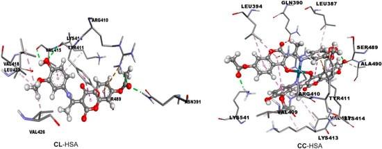 Figure 8. The hydrogen bonds (green dotted lines) and hydrophobic (rose pink dotted lines) docking interactions of the most stable conformations of the selected compounds with HSA.