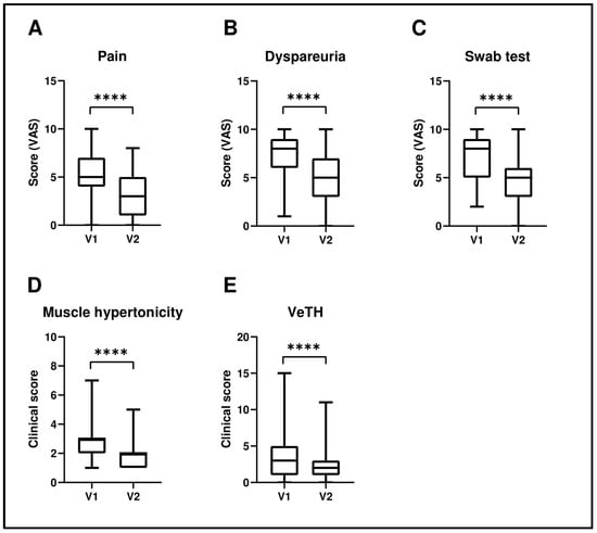 Comparison of pre-treatment (V1) and post-treatment (V2) data for pain (A), dyspareunia (B), swab test (C), muscular hypertonicity (D), and vestibular trophism (E). Statistical analysis was performed using the Wilcoxon signed-rank test for paired data. **** p < 0.0001.